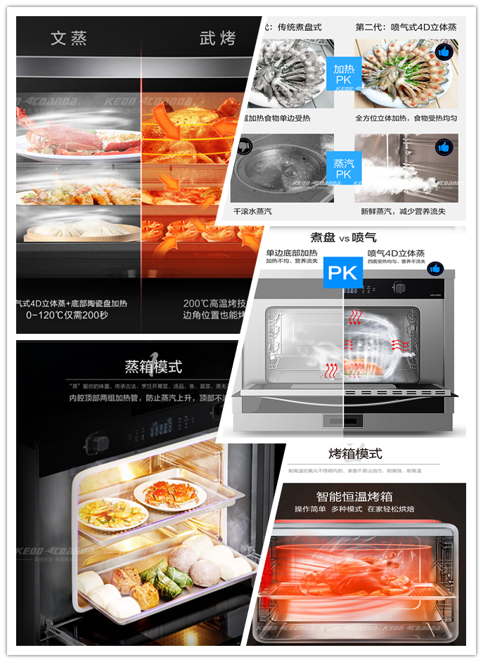 下方搭載的蒸烤消功能,一鍵輕松搞定,通過“薩萊米”陶瓷加熱盤產生蒸汽,并滲入食物中來使食物熟透,底部有一個光滑平整的加熱盤,隱形導流管將外置水箱中的水引流至加熱盤內,加熱盤不斷升溫,到一定溫度時,盤內的水即會蒸發成水蒸汽,蒸汽在箱內彌漫,滲入食物中,使美食做到外酥里嫩,營養不流失。多種蒸烤模式選擇能同時滿足用戶多樣化的烹飪需求,除此之外還有高溫消毒模式,為廣大用戶飲食健康提供有力保障!