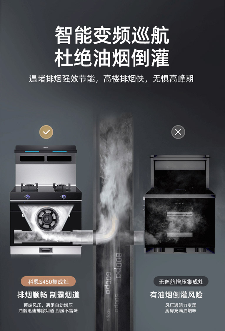 集成灶得以實(shí)現(xiàn)高效油煙吸凈率,則是源自對吸油煙方式的改變,將傳統(tǒng)上行排煙升級為側(cè)吸下排,集成灶十大品牌、廚電行業(yè)十大品牌科恩S450變頻大吸力左右蒸烤集成灶20m3/min澎湃大吸力,S級豪華轎車品質(zhì),低空封鎖油煙升騰區(qū),清爽爆炒不過臉,吸凈雙灶爆炒煙,搭載智能變頻巡航系統(tǒng),遇堵排煙強(qiáng)效節(jié)能,高樓排煙快,無懼高峰期。