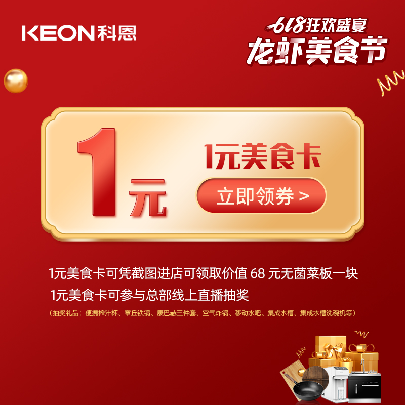 萬人品美食,0元搶科恩,5月28日——6月18日,凡購買1元美食特權(quán)卡的用戶,即可參與總部線上直播抽獎活動:便攜榨汁機(jī)/章丘鐵鍋/康巴赫鍋具三件套/空氣炸鍋/移動水吧/集成水槽等/集成水槽洗碗機(jī).1元購卡,送價值68元無菌菜板,還能獲得直播大抽獎資格,重磅豪禮有機(jī)會收入囊中,有沒有很心動?!