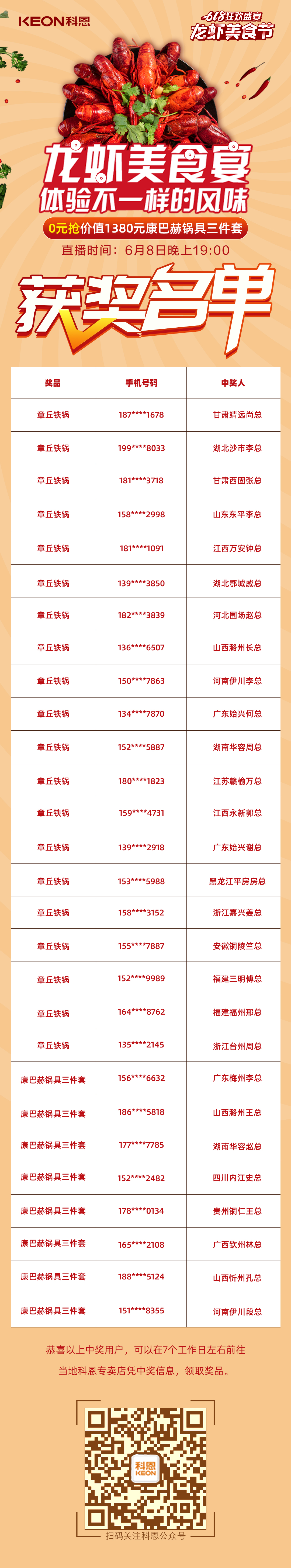 話不多說,先來公布6月8日晚龍蝦美食宴直播現(xiàn)場中獎名單,恭喜以下28位幸運(yùn)寶寶!請?jiān)谄邆€工作日左右,憑中獎信息到當(dāng)?shù)乜贫鲗Yu店領(lǐng)取您的專屬獎品!沒有中獎的寶寶也不用氣餒,沒準(zhǔn)下一期的直播大獎就在向你招手!你就是幸運(yùn)錦鯉本鯉!