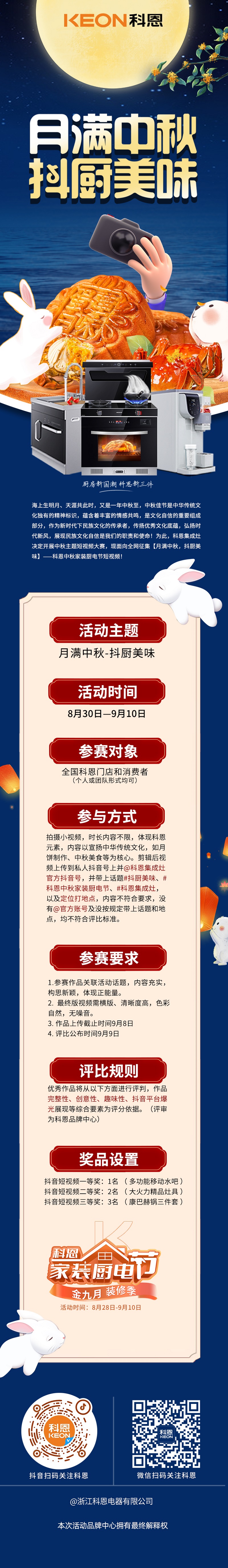 海上生明月、天涯共此時,又是一年中秋至,中秋佳節是中華傳統文化獨有的精神標識,蘊含著豐富的情感共鳴,是文化自信的重要組成部分,作為新時代下民族文化的傳承者,傳揚優秀文化底蘊,弘揚時代新風,展現民族文化自信是我們的職責和使命!為此,科恩集成灶決定開展中秋美食節短視頻大賽,現面向全網征集【月滿中秋,抖廚美味】——科恩中秋家裝廚電節短視頻!