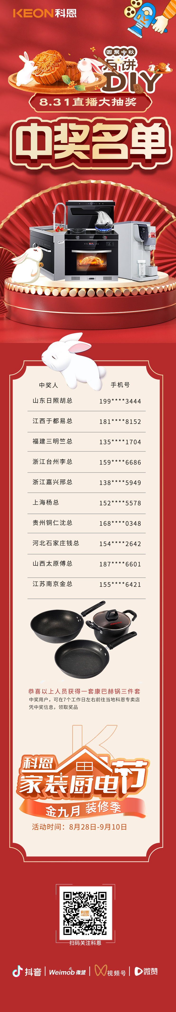8月31日晚7點(diǎn),科恩家裝廚電節(jié)直播第一期——圓聚中秋,月餅DIY已順利錄下帷幕,直播現(xiàn)場(chǎng)精彩紛呈,不僅有主播手把手教做科恩私房月餅,更有購(gòu)1元廚電特權(quán)卡抽大獎(jiǎng)活動(dòng)!此時(shí)此刻,想必屏幕前的你們一定非常關(guān)注獲獎(jiǎng)結(jié)果,話不多說(shuō),快來(lái)看看,這次獲獎(jiǎng)名單中有你嗎?