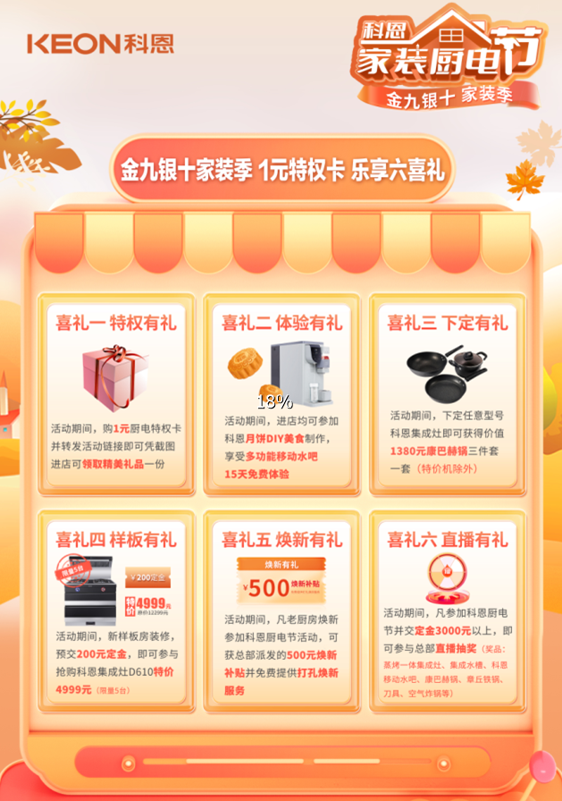 金九銀十家裝季,科恩集成灶推出科恩家裝廚電節,不僅有1元家裝特權卡,0元搶廚電,提前鎖定直播抽大獎名額,還能樂享六大喜禮,特權有禮、下定有禮、樣板有禮、煥新有禮、直播有禮,進店即可參加科恩月餅DIY美食制作,還有15天移動水吧免費體驗,一塊錢就能買到的快樂,怎么算都劃算!