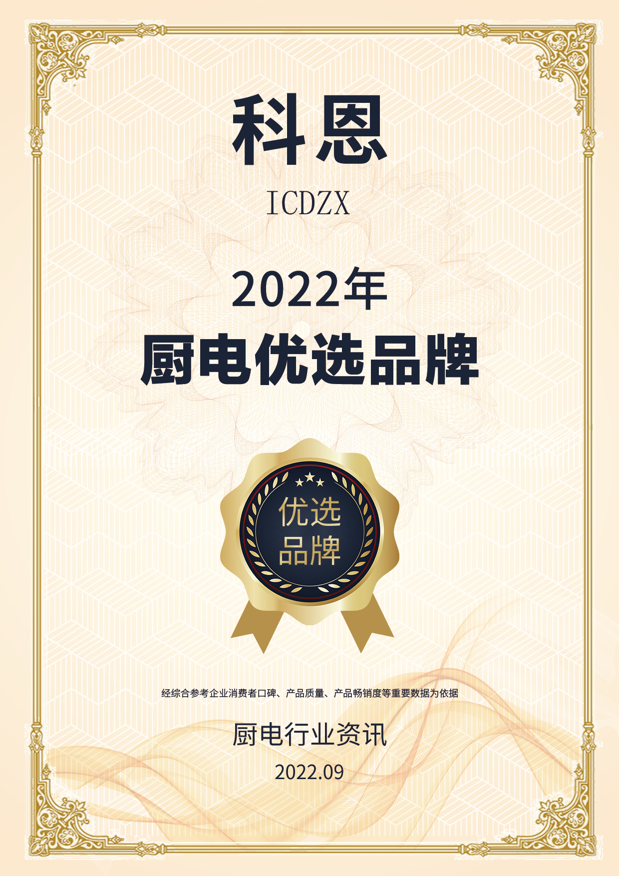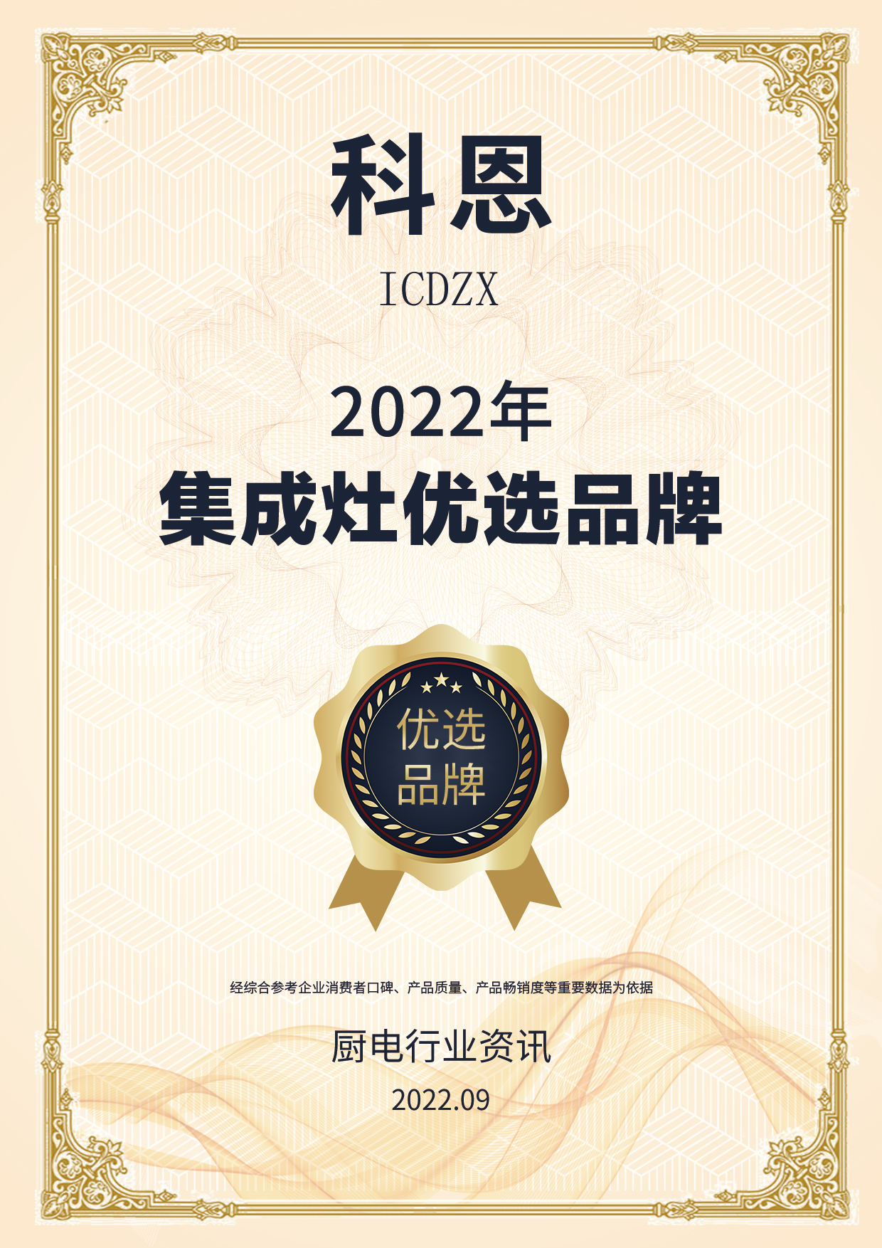 喜報!喜報!喜報!浙江科恩電器有限公司榮獲2022年度質(zhì)量月廚電行業(yè)|集成灶行業(yè)優(yōu)選品牌兩項殊榮!