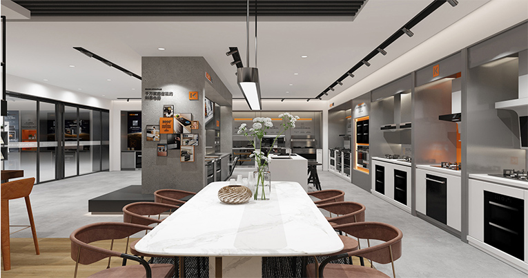 科恩新門店簡約、大氣、精美的視覺沖擊讓人印象深刻,開放式瀏覽路徑,通過“視覺+產(chǎn)品+體驗(yàn)”的融合,以差異化彰顯品牌個(gè)性,讓消費(fèi)者通過感知產(chǎn)品來感受品牌,對多個(gè)區(qū)域進(jìn)行場景重構(gòu),產(chǎn)品陳列區(qū)、廚房場景、品牌背書、洽談區(qū)等,通過模塊化的方式,將核心產(chǎn)品模塊以及開放式廚房體驗(yàn)場景植入門店,體現(xiàn)了更具應(yīng)用價(jià)值的“新潮牌”!
