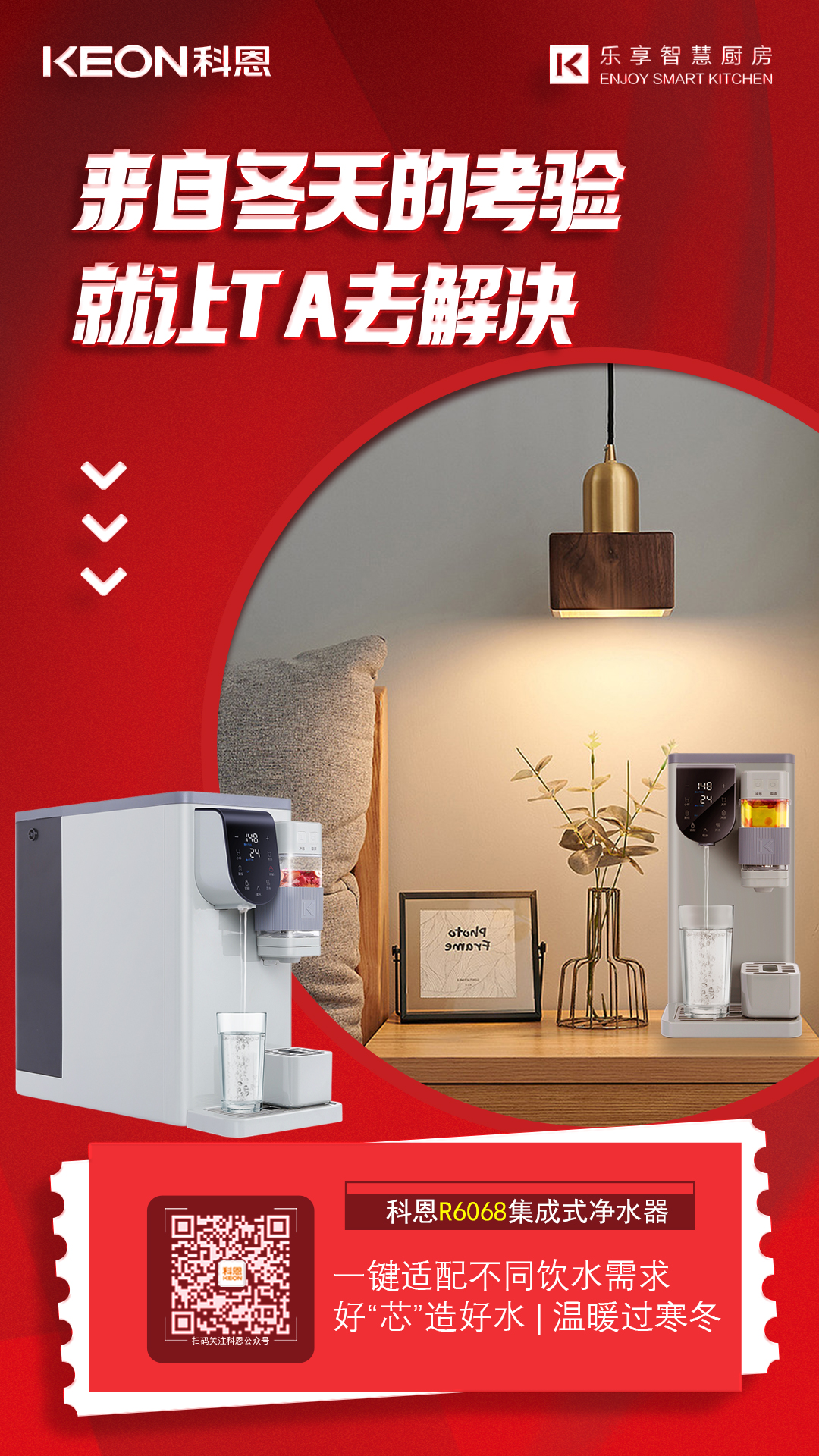 科恩集成式凈水器,RO精濾,UV殺菌,集凈飲加熱于一體,采用即熱和智能溫控技術(shù),實(shí)現(xiàn)快速制熱,無極控溫,水量可調(diào),滿足不同人群的用水需求,無論是老爸的一壺茶、親友的咖啡、果茶、寶寶的沖奶水,一應(yīng)俱全,讓全家人在這個(gè)冬天隨時(shí)喝上安全健康水,暖胃更暖心。