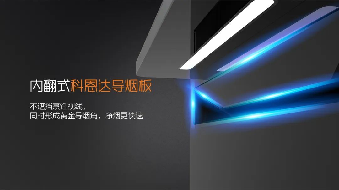 特有的內(nèi)傾科恩達導煙網(wǎng)板不遮擋視線,且形成獨特的吸煙黃金角,讓油煙在鍋口就被吸走,0跑煙,廚房更清新!