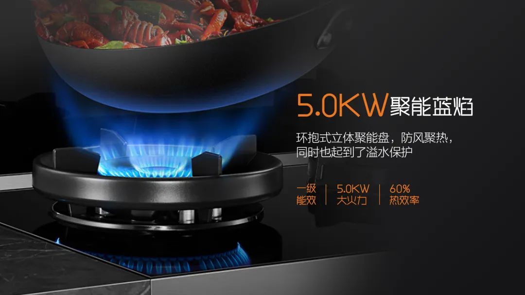 兩個5.0KW聚能藍焰大火力爆炒綽綽有余,一個1.6KW定時文火小火灶,燉湯最為合適!