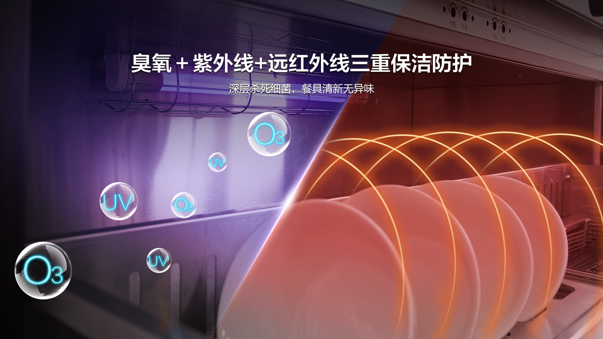 消毒柜采用臭氧+紫外線+遠(yuǎn)紅外線三重保潔防護(hù),深層殺死細(xì)菌,保障餐具清新無異味。