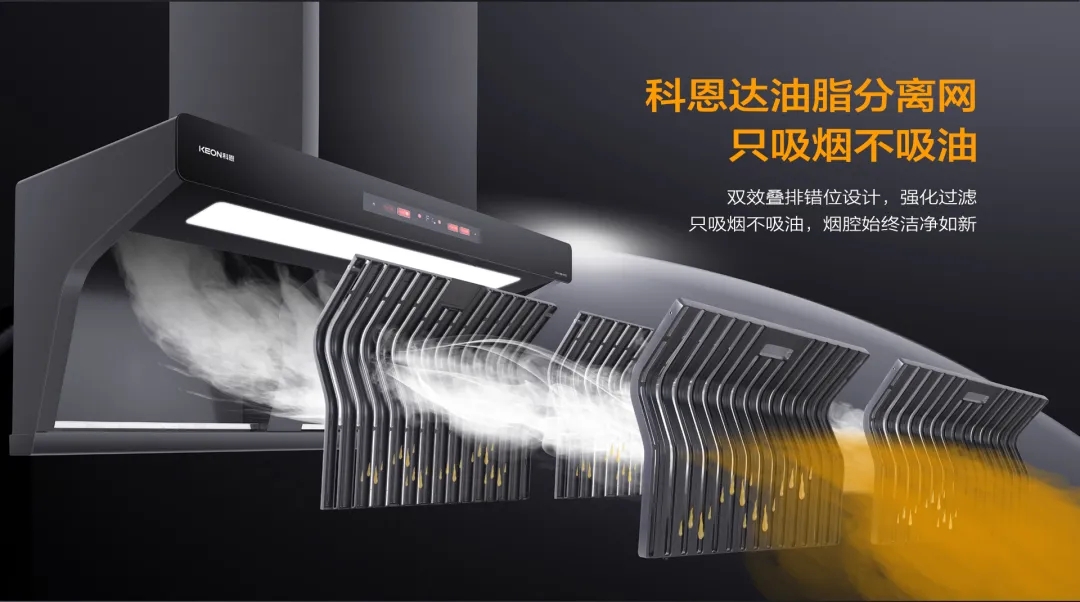 科恩6530免清洗煙機,采用科恩達油脂分離網,真正做到油脂分離,廚房無煙。