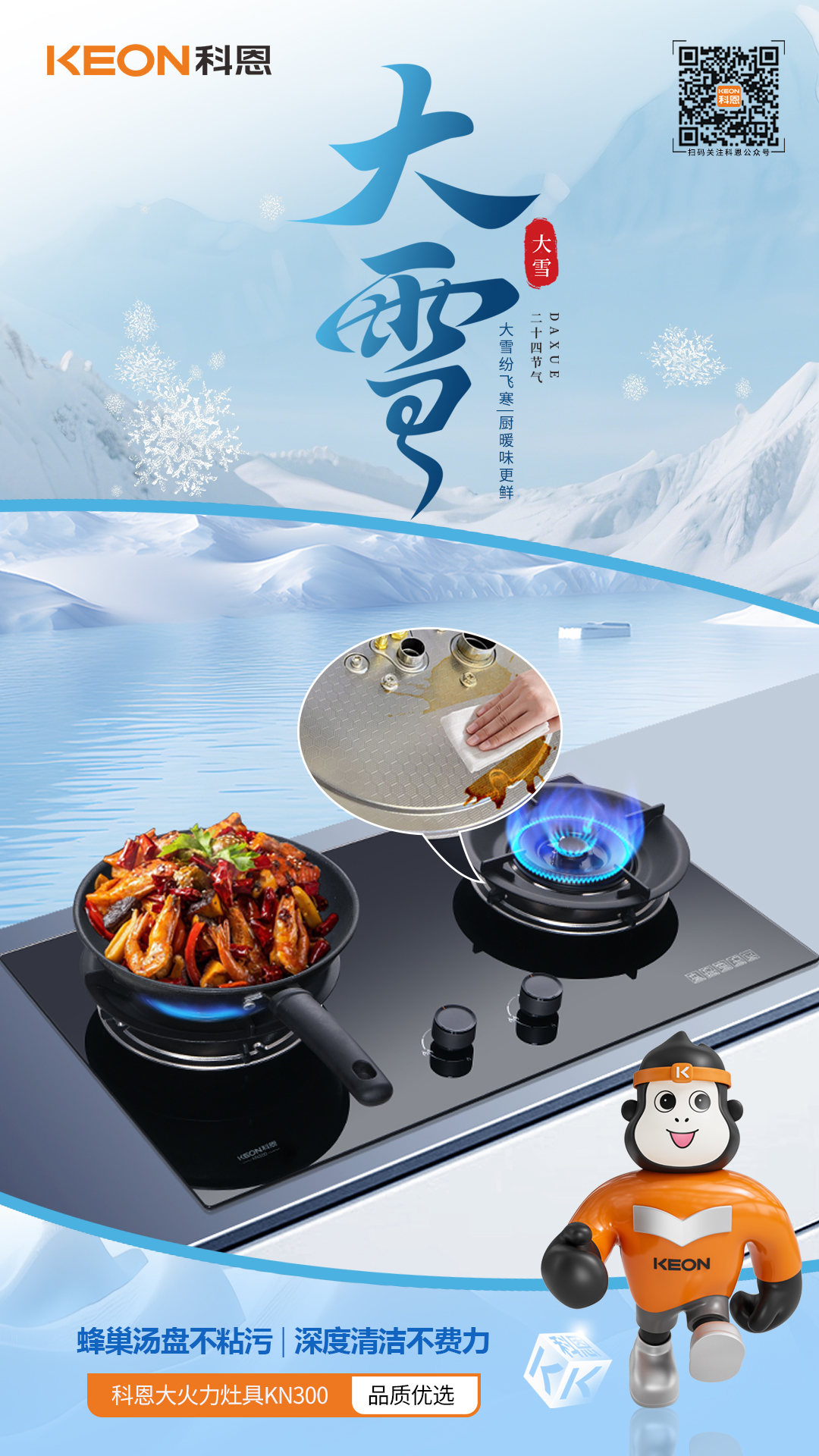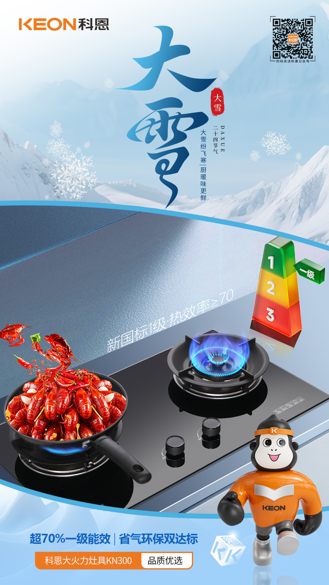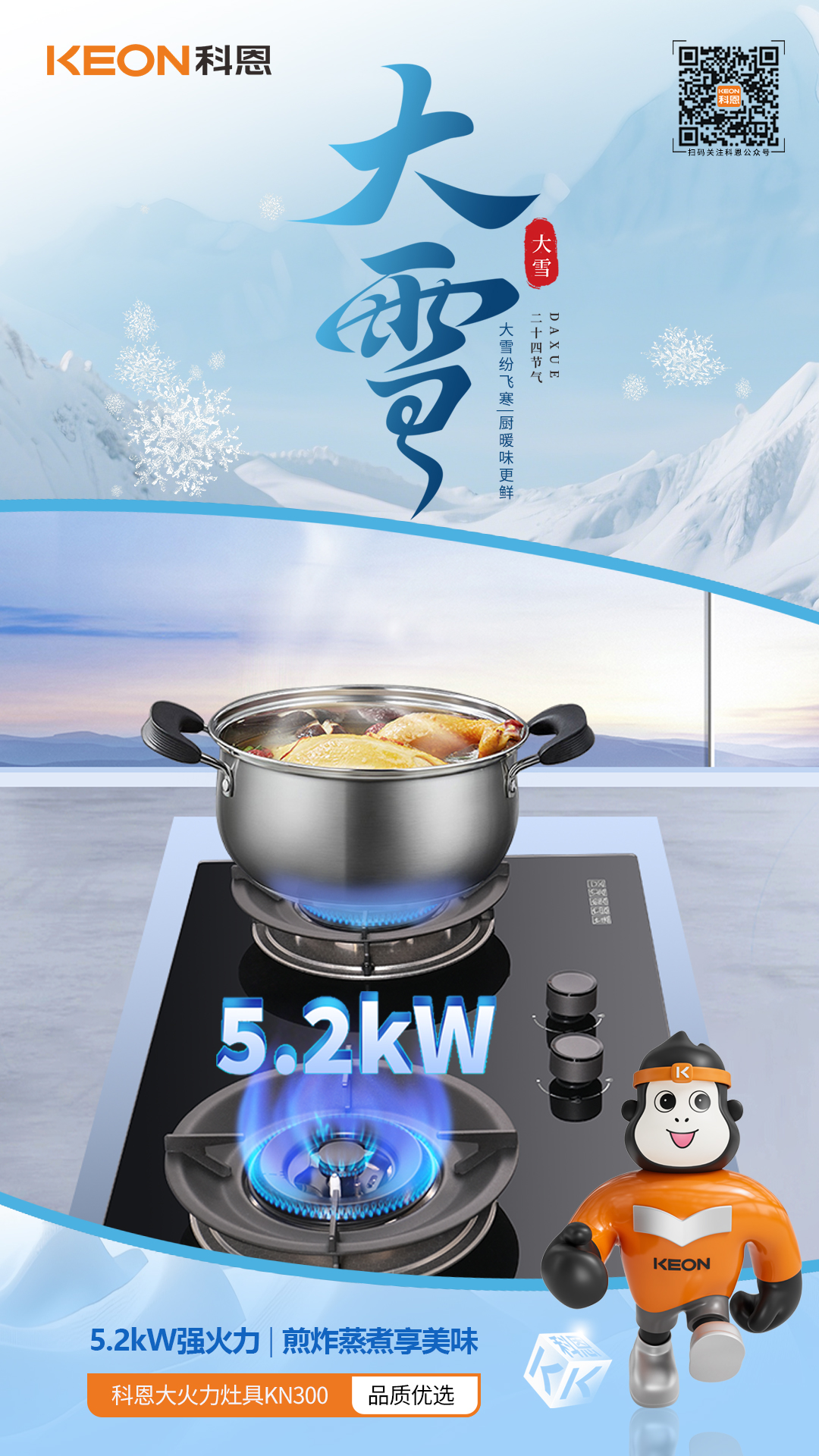 大雪煥新,暖意相伴。科恩KN300滿配實力,小灶大能,烹鮮首選,煎炒烹炸樣樣精通,健康美味輕松拿捏。選擇KN300灶具,讓大雪廚房暖意融融!