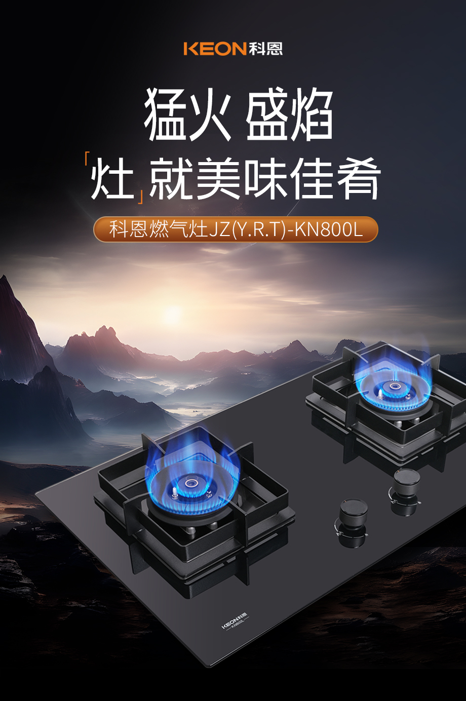 大火高效,節能省氣5.2KW超猛火力,爆炒更夠味三腔高效混合燃燒,火焰強勁更集中KN800L灶具一級能效節能省氣更環保0-170°寬域調火,精準把控每一度,慢燉煨湯味醇厚,爆炒收汁香濃郁。安全耐用,品質保障。廚房用火險,安全防護是關鍵,黑晶鋼化玻璃面板,光滑耐腐易清潔,航空級鋁合金燃燒器,防銹耐高溫不變形黑色亞光搪瓷爐架,耐腐蝕不易壞防燙防滑旋鈕,隔熱更安心意外熄火瞬切氣源,隱患杜絕于萌芽