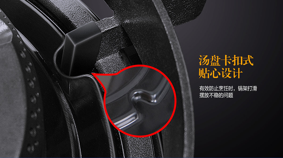 - 湯盤與鍋架采用靜音卡扣式定位固定,不滑鍋更安全